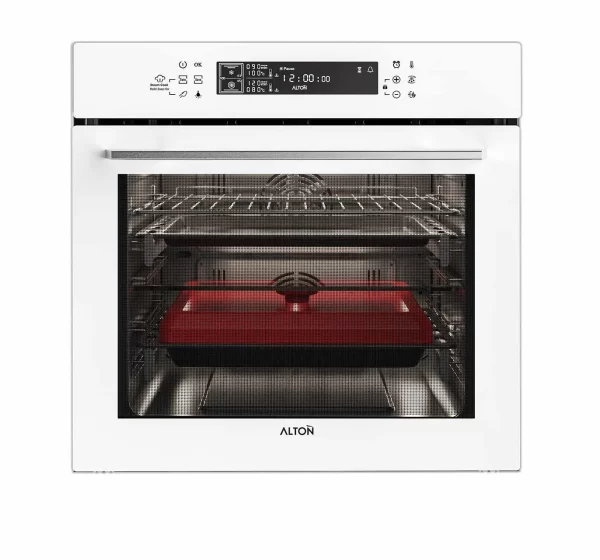 فر توکار آلتون V500TW برقی این فر دارای شیشه اپتیک سفید و twin دوقلو (دارای 2 فر مجزا و امکان تبدیل به یک فر) به همراه بخار پز نمودن و حجم داخلی 72 لیتر و درب 4 جداره جداشونده و صفحه نمایش دیجیتال لمسی و 17 برنامه پخت و قفل کودک و تایمر پیشرفته زمان پخت و برنامه یخ زدایی و سیستم meat probe حسگر پخت گوشت و فن گردش هوای داغ می باشد.